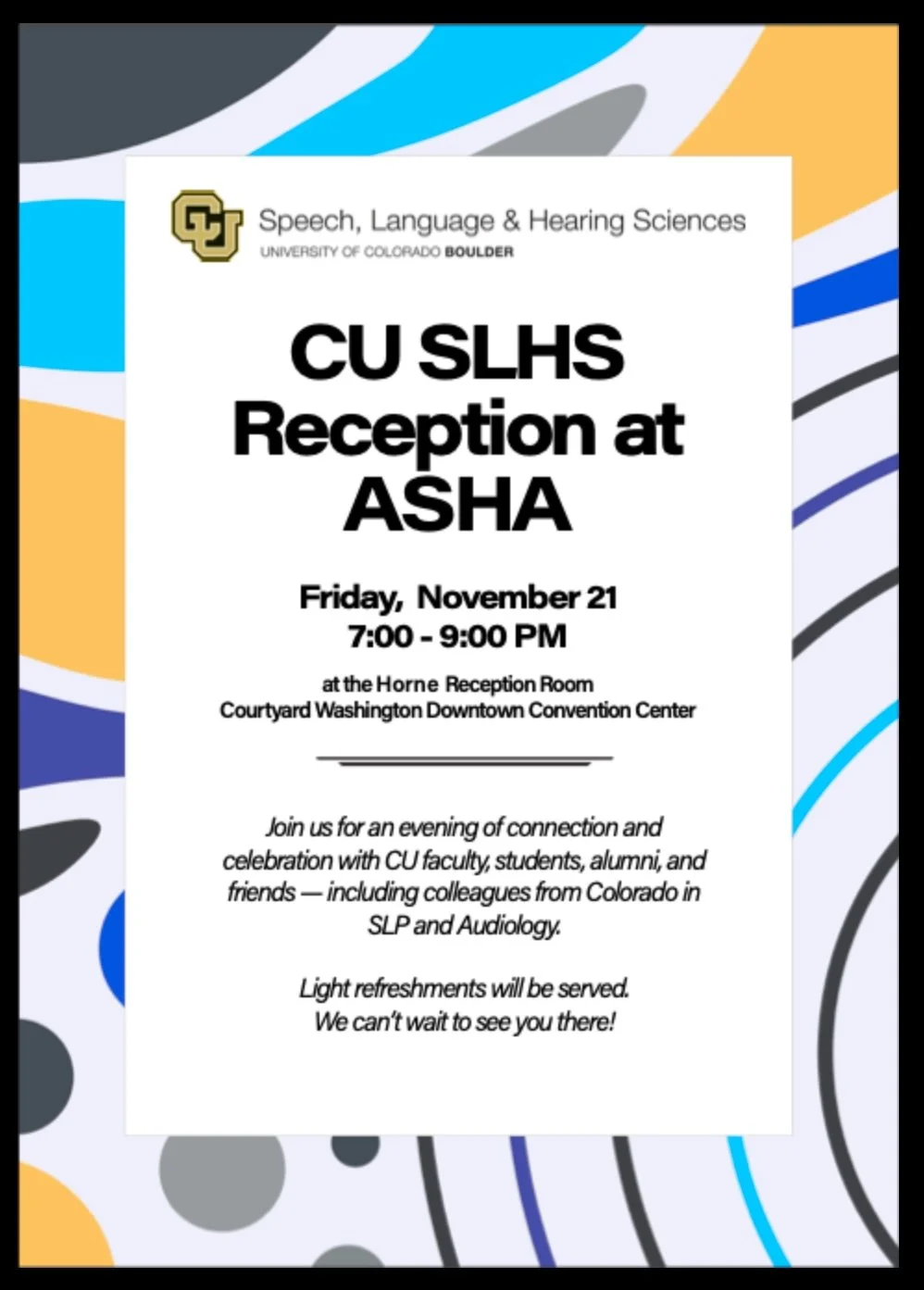 Greetings! Alumni are invited to the SLHS Reception at ASHA. You are welcome to stop by or stay longer to catch up with our former students, colleagues, and friends.